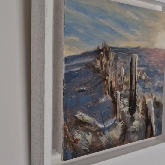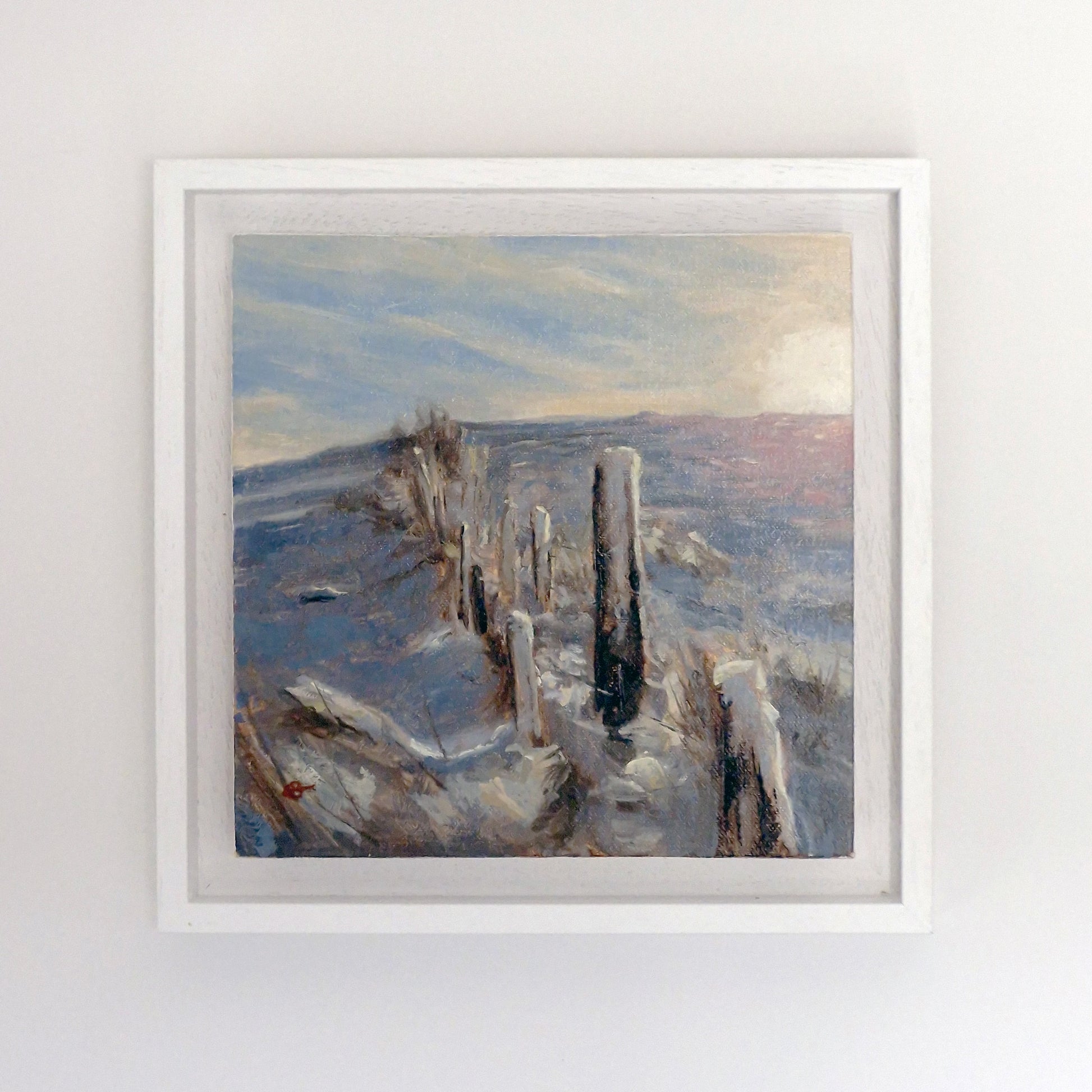 This ready to hang painting measures 20cm x 20cm and is presented in a 25cm x 25cm white wooden St Ives style frame, fitted with D-rings and cord – ready to hang straight out of the box.