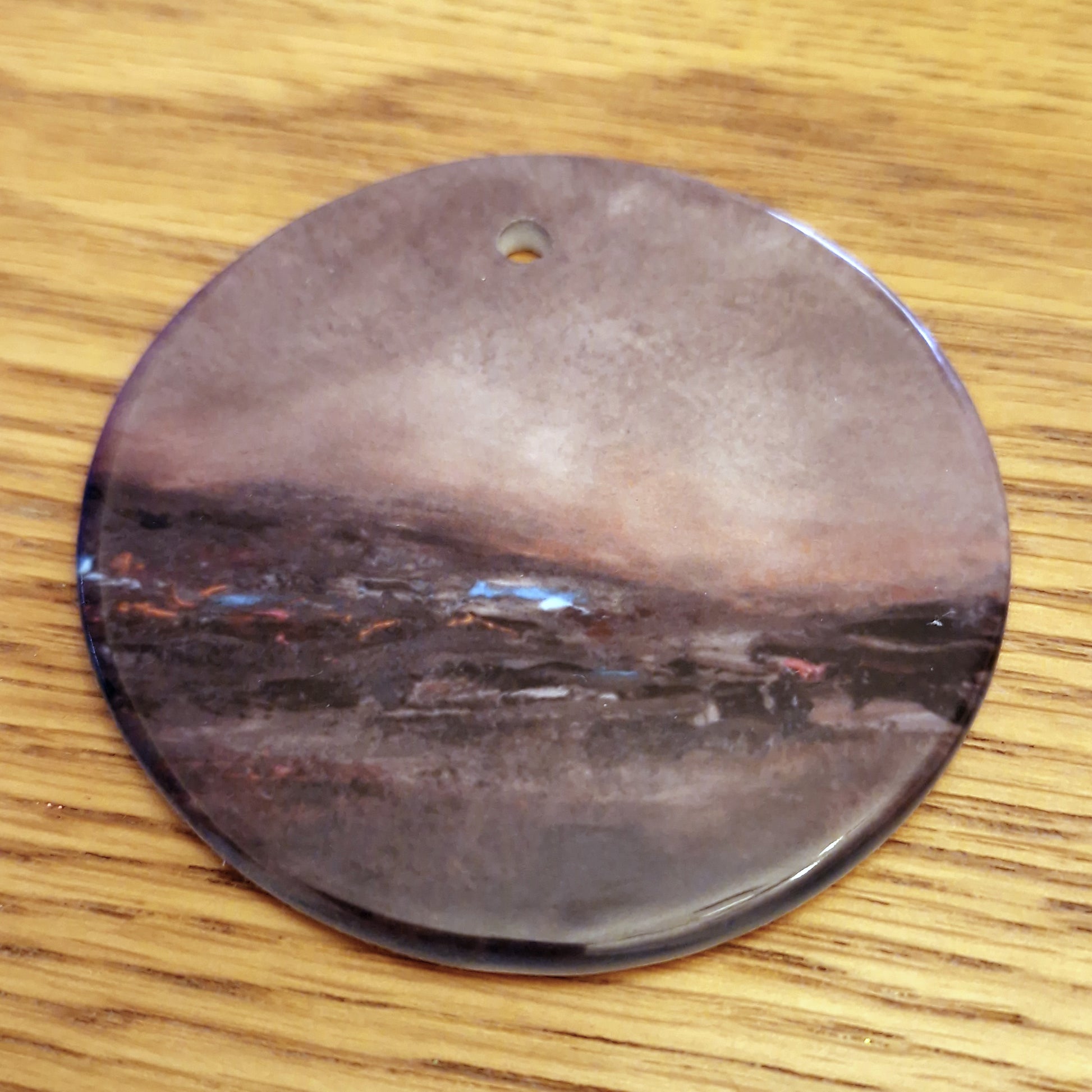 Capture the quiet drama of the Scottish Highlands with this elegant hanging ceramic ornament, featuring the artwork of Glimmers from the Shore.