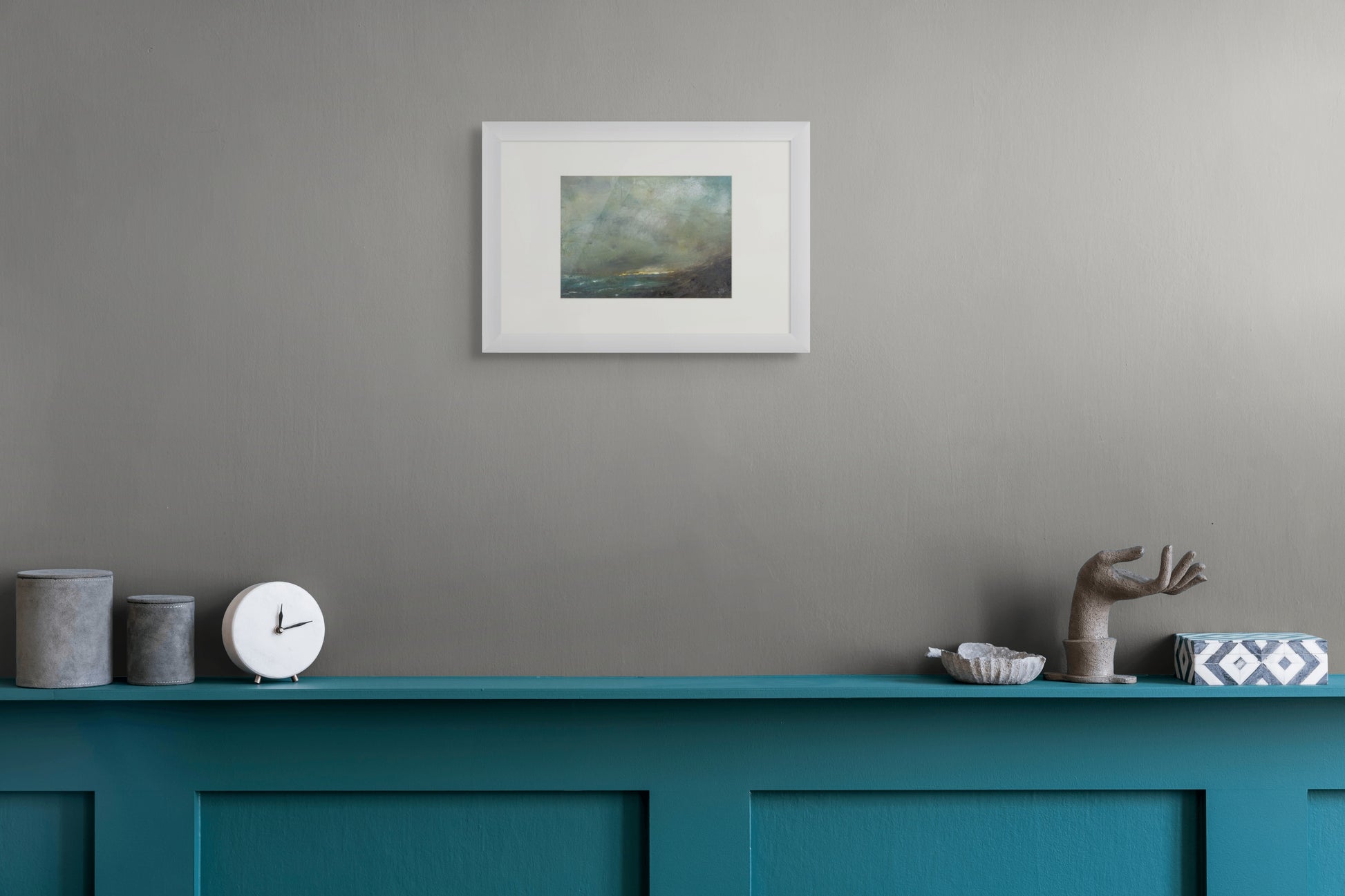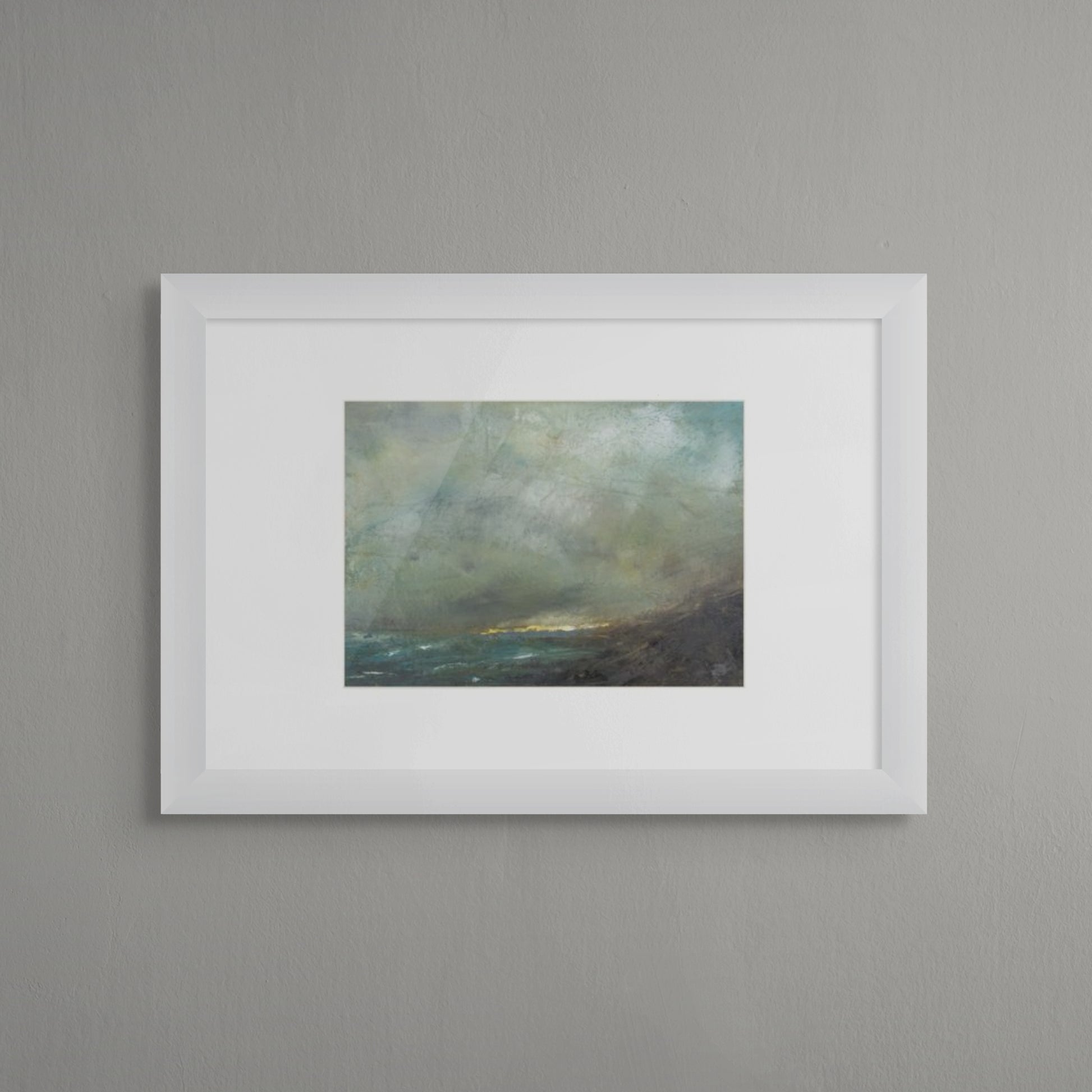 This ready to hang painting measures 7" x 5" and is mounted and presented in a 12" x 8" white wooden frame with glass glazing.