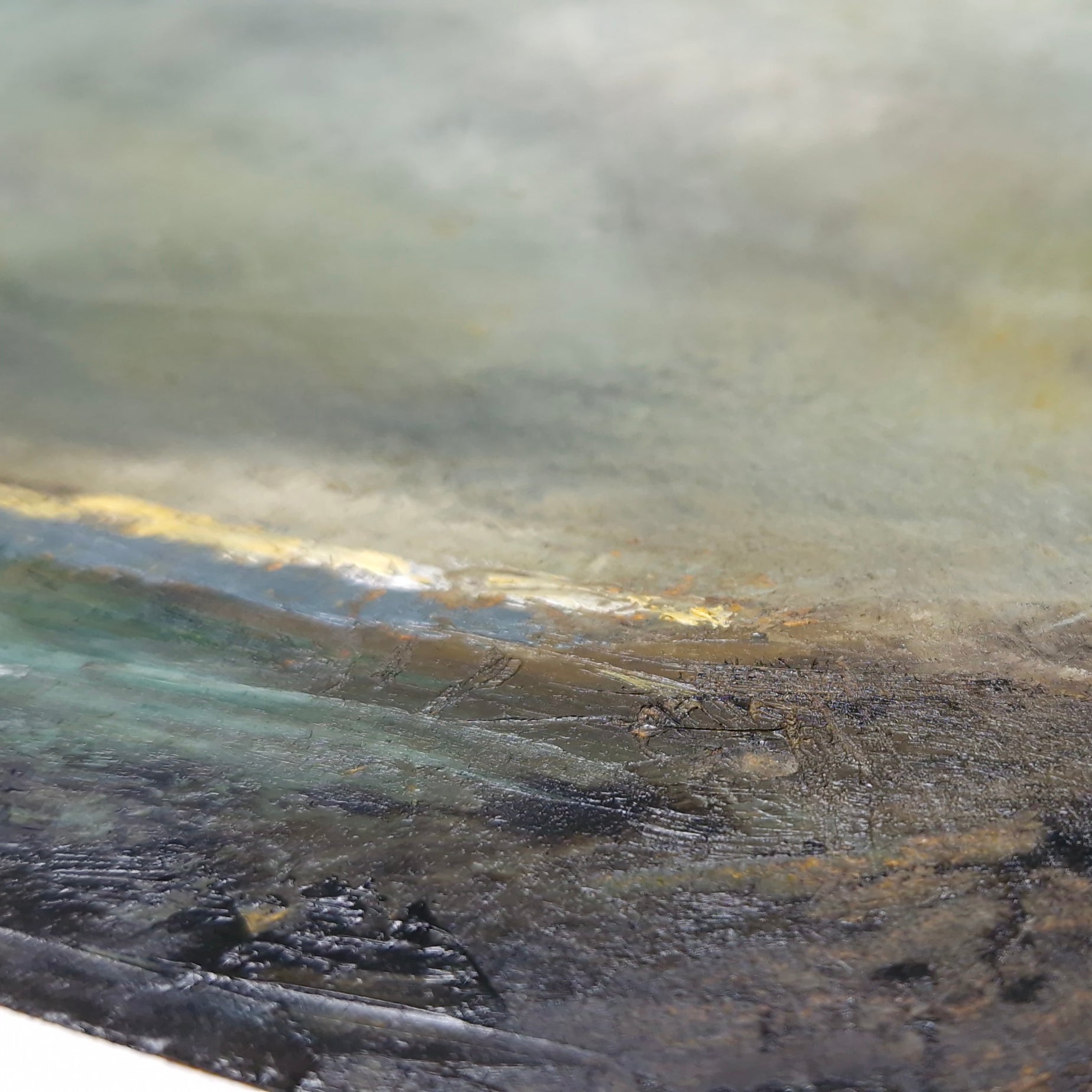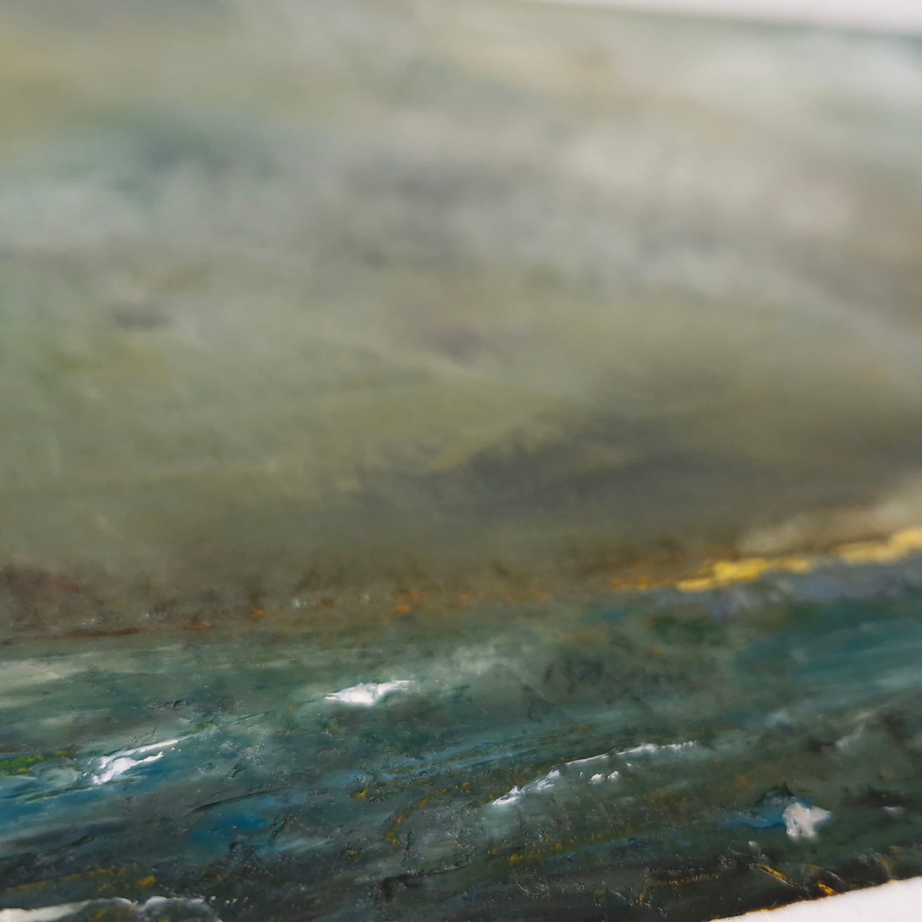 In the foreground, darkened sand and gently lapping waves evoke stillness and solitude, while layered textures and distressed mark-making bring a raw, tactile energy to the surface. Built through cold wax and expressive palette knife work, the composition reflects the fleeting beauty of dusk on the Scottish coast - where land, sea, and sky meet in quiet conversation.