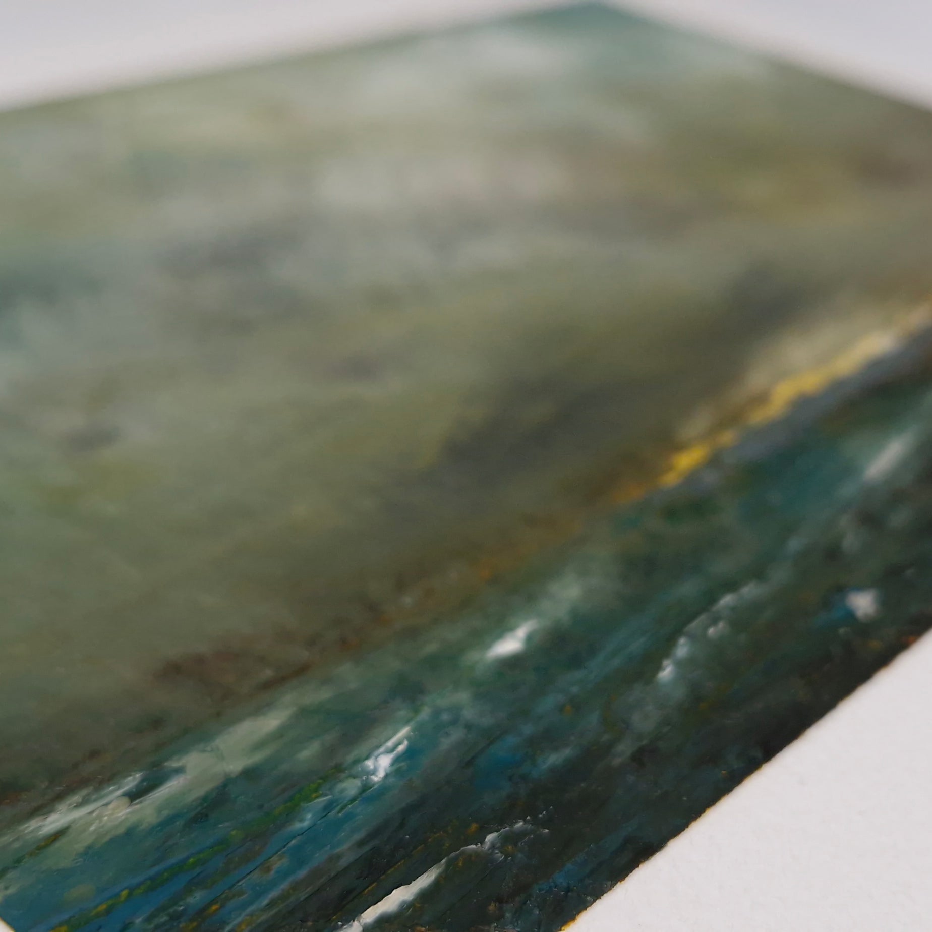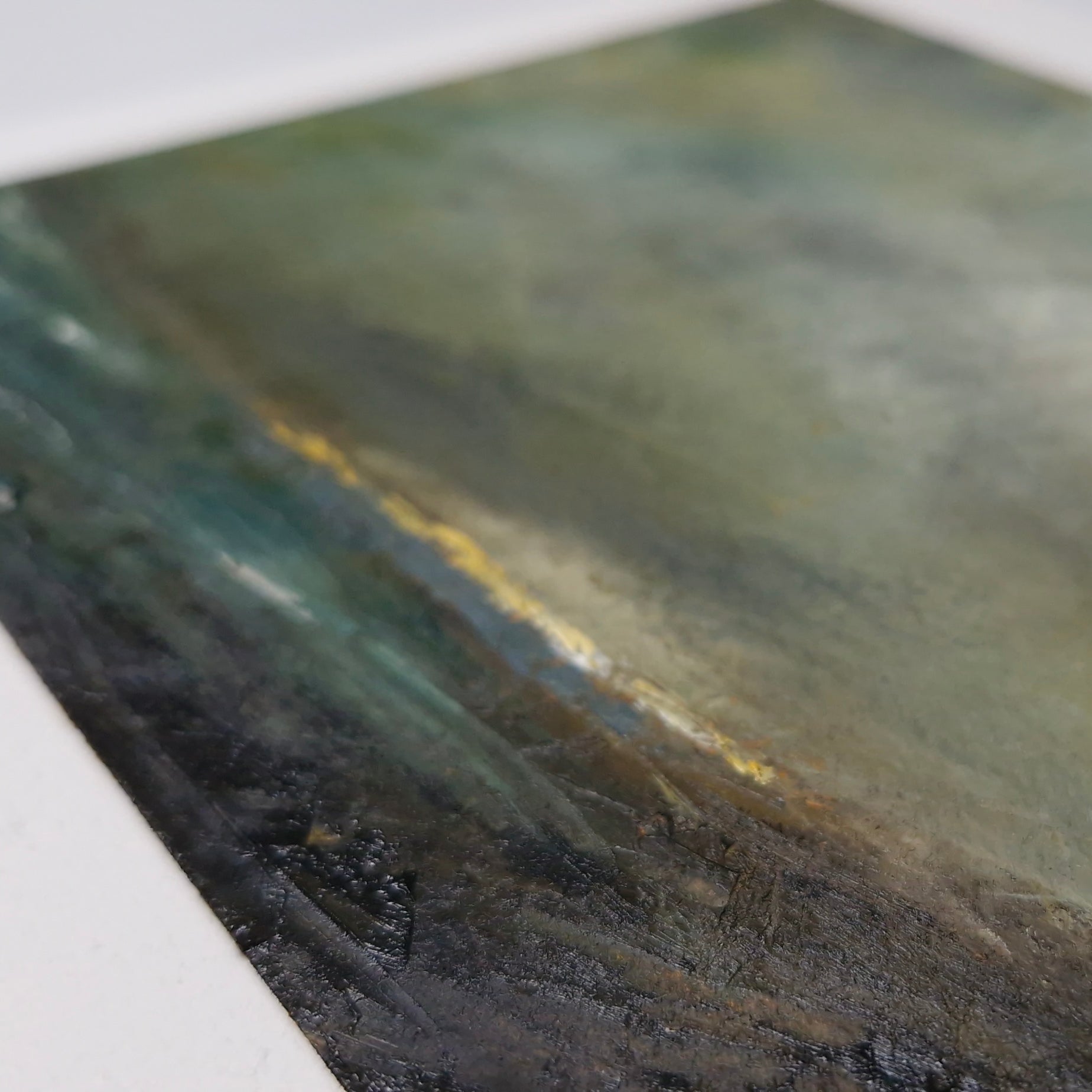 This atmospheric original oil and cold wax painting captures the quiet drama of sunset over Prestwick Beach in Ayrshire. A slip of golden sunlight breaks beneath a brooding bank of blue-grey clouds, casting a warm glow across the distant horizon.