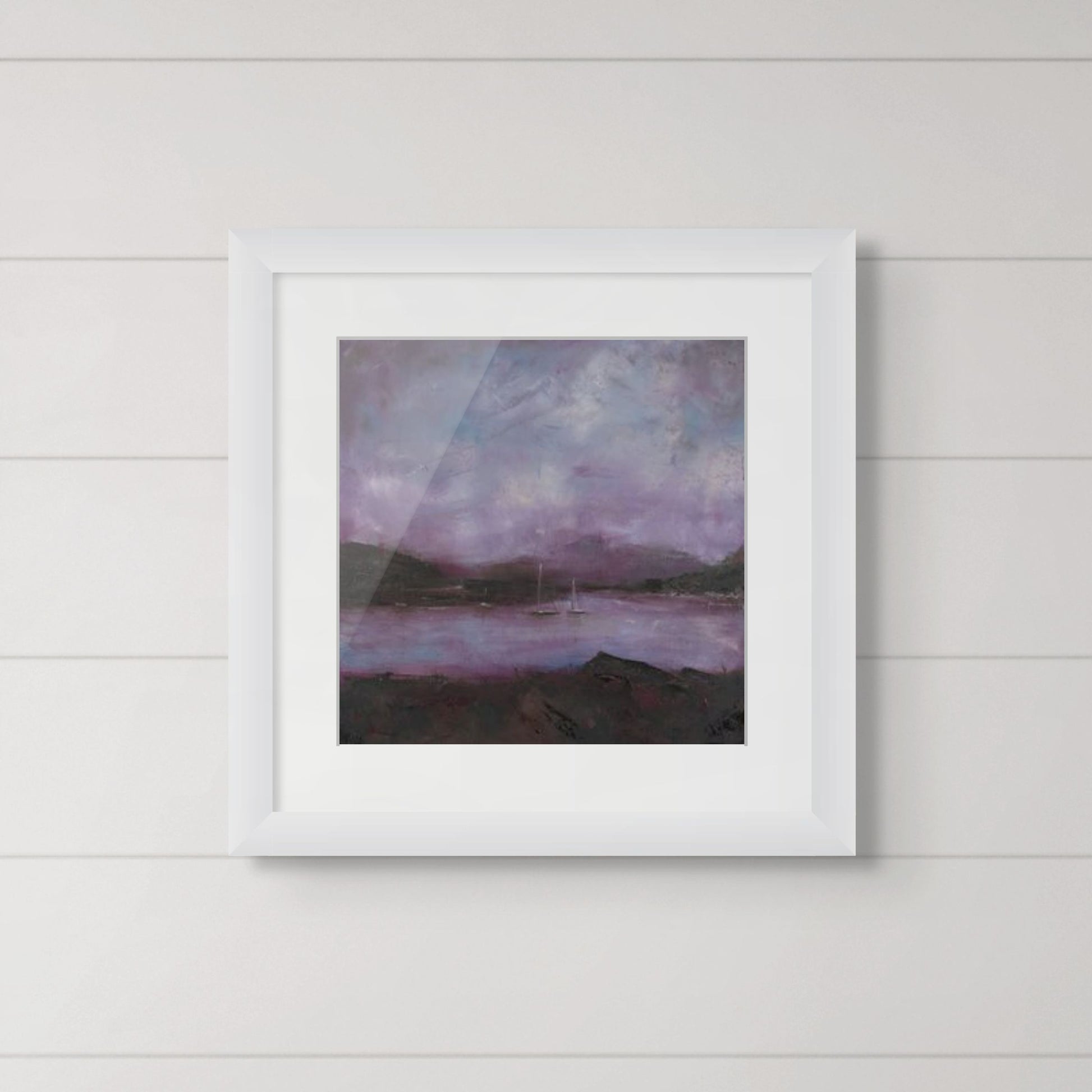 Bring the calm of a Millport evening into your home with this original oil and cold wax painting - an expressive view looking out across Newtown Bay toward Wee Cumbrae and Arran fading in the distance.
