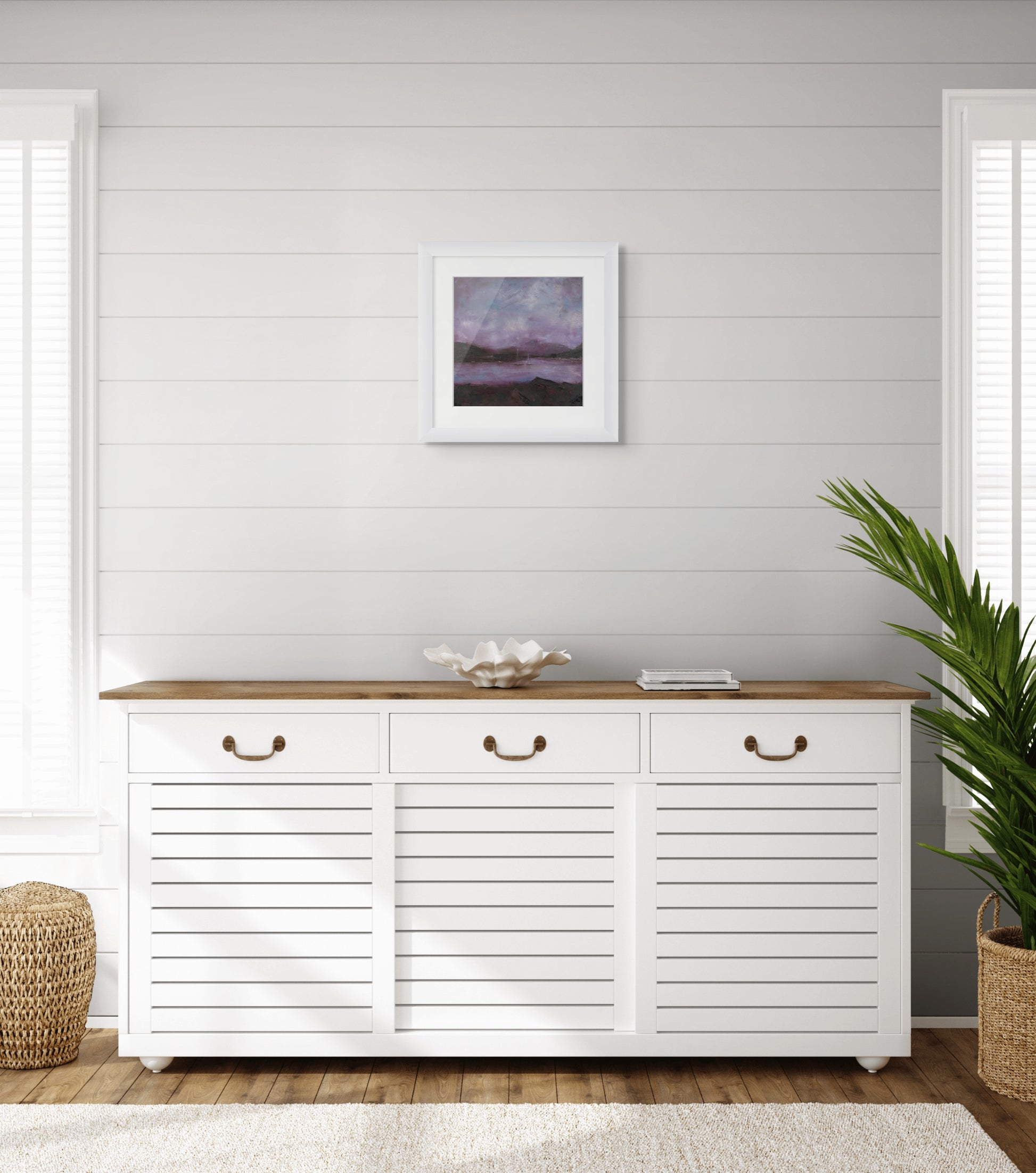 Inspired by the quiet magic of coastal evenings, this piece glows with layered purples, smoky greys, and soft blues, with a warm, dreamlike hue throughout. Bold palette knife marks and cold wax textures add richness and movement to the surface, evoking the breeze, light, and shifting sea.