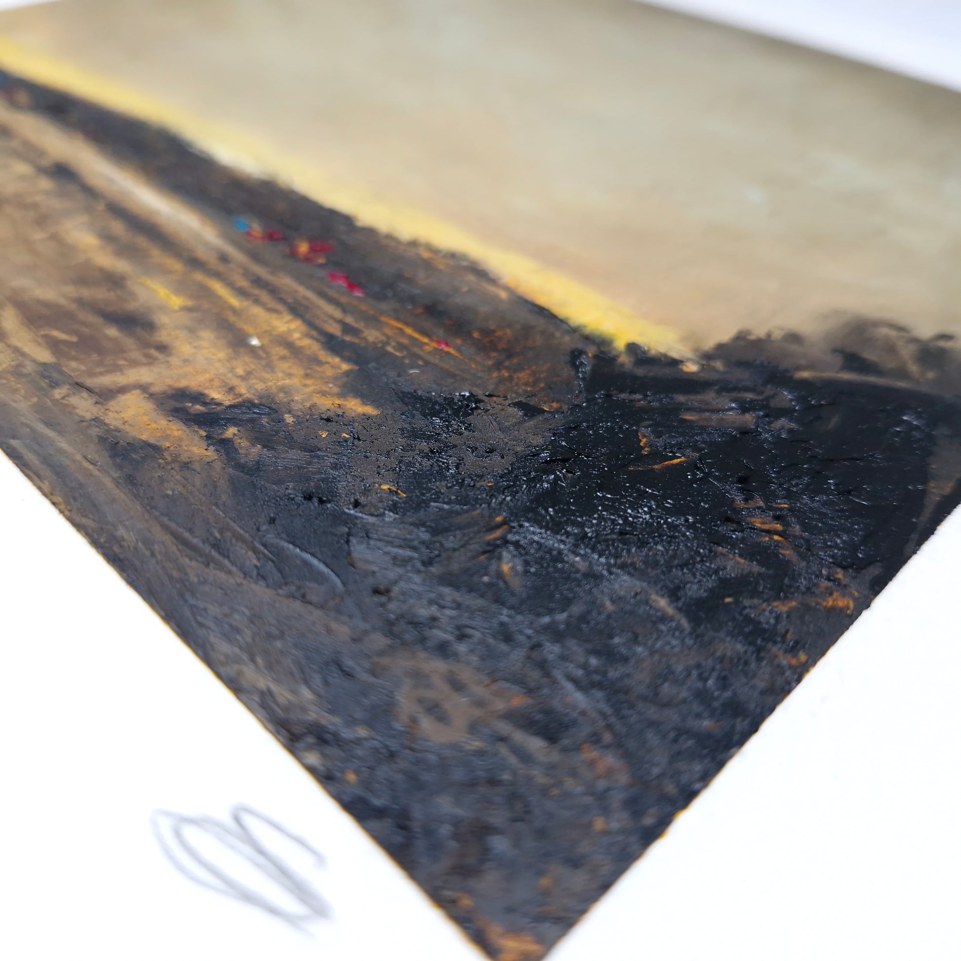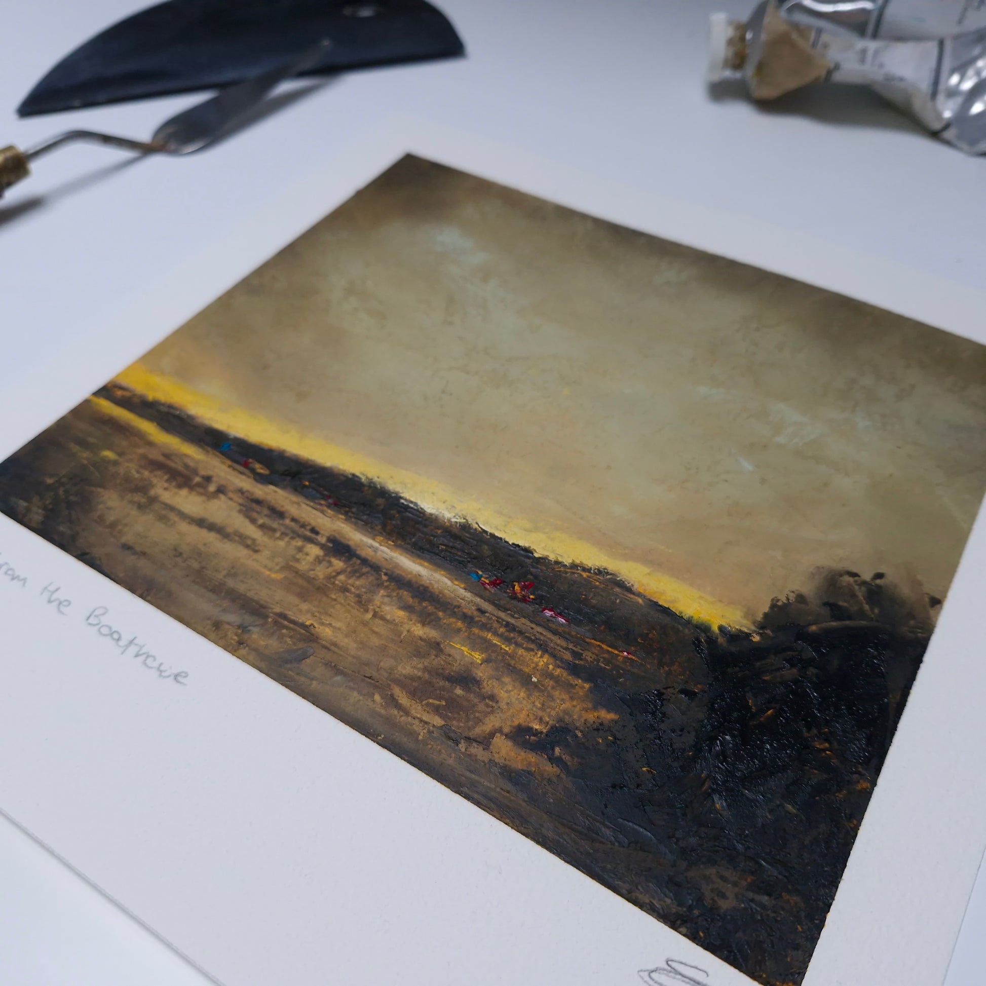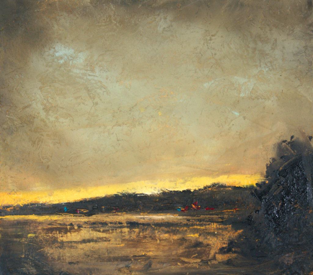 This expressive oil and cold wax painting captures the serene calm of Loch Fyne, viewed from Castleton in Argyll and Bute. As the sun slips beneath a bank of dark clouds, a sliver of light emerges at the horizon—casting a quiet golden shimmer across the loch’s still surface.