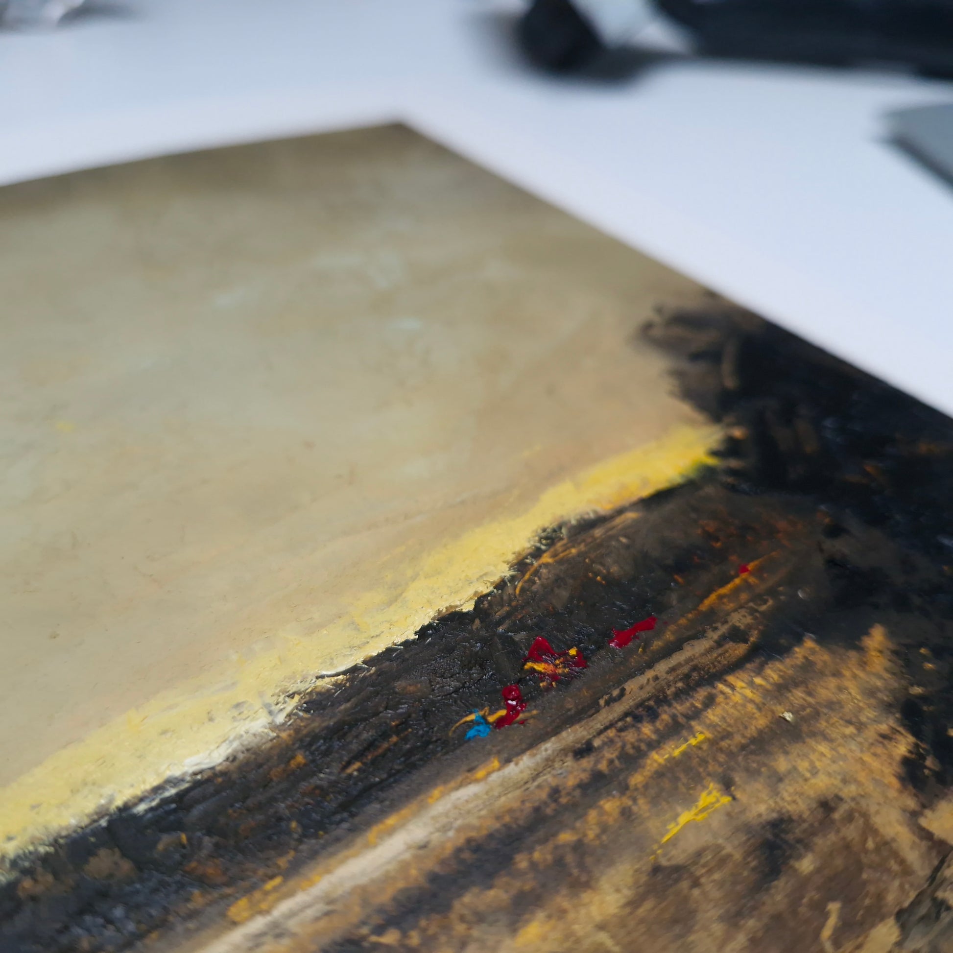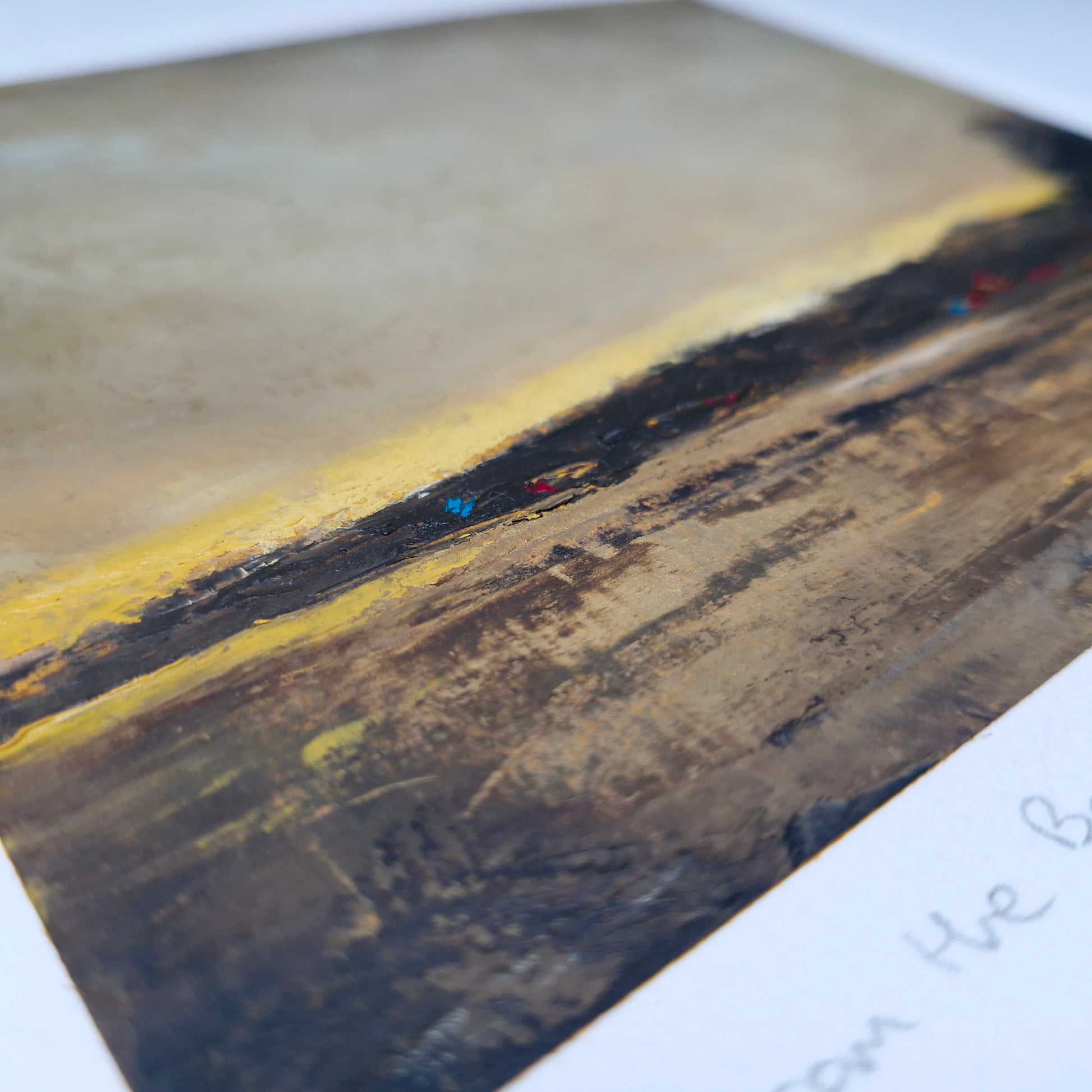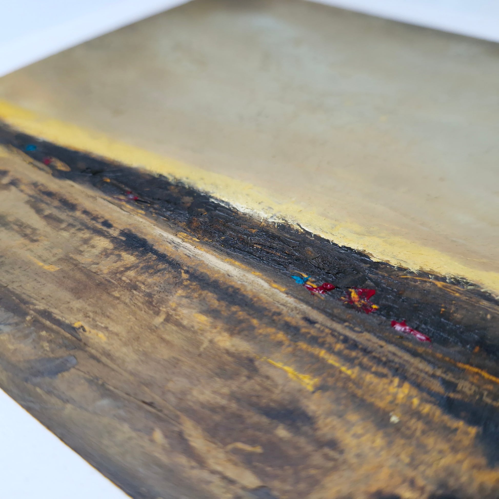 This expressive oil and cold wax painting captures the serene calm of Loch Fyne, viewed from Castleton in Argyll and Bute. As the sun slips beneath a bank of dark clouds, a sliver of light emerges at the horizon—casting a quiet golden shimmer across the loch’s still surface.