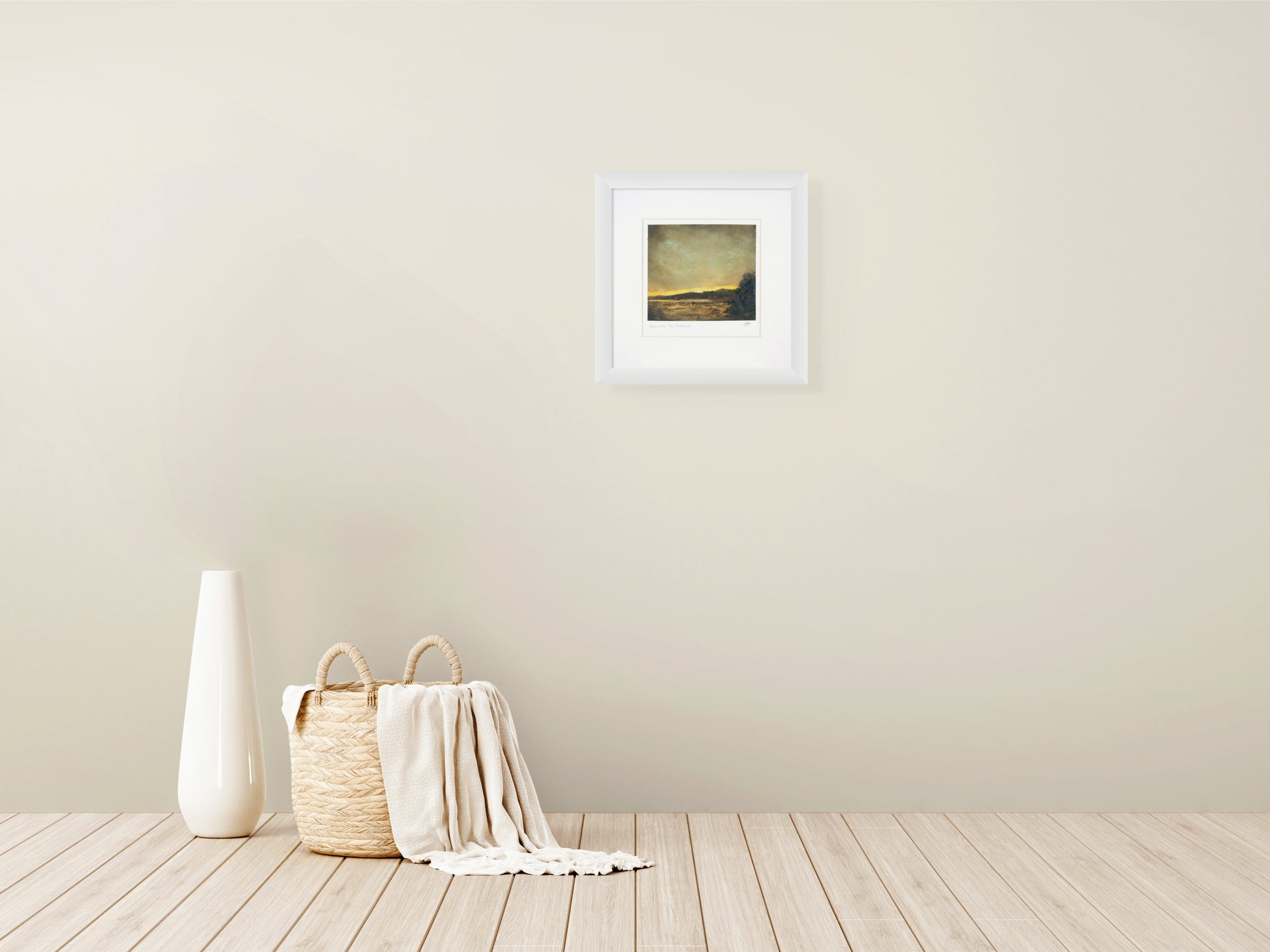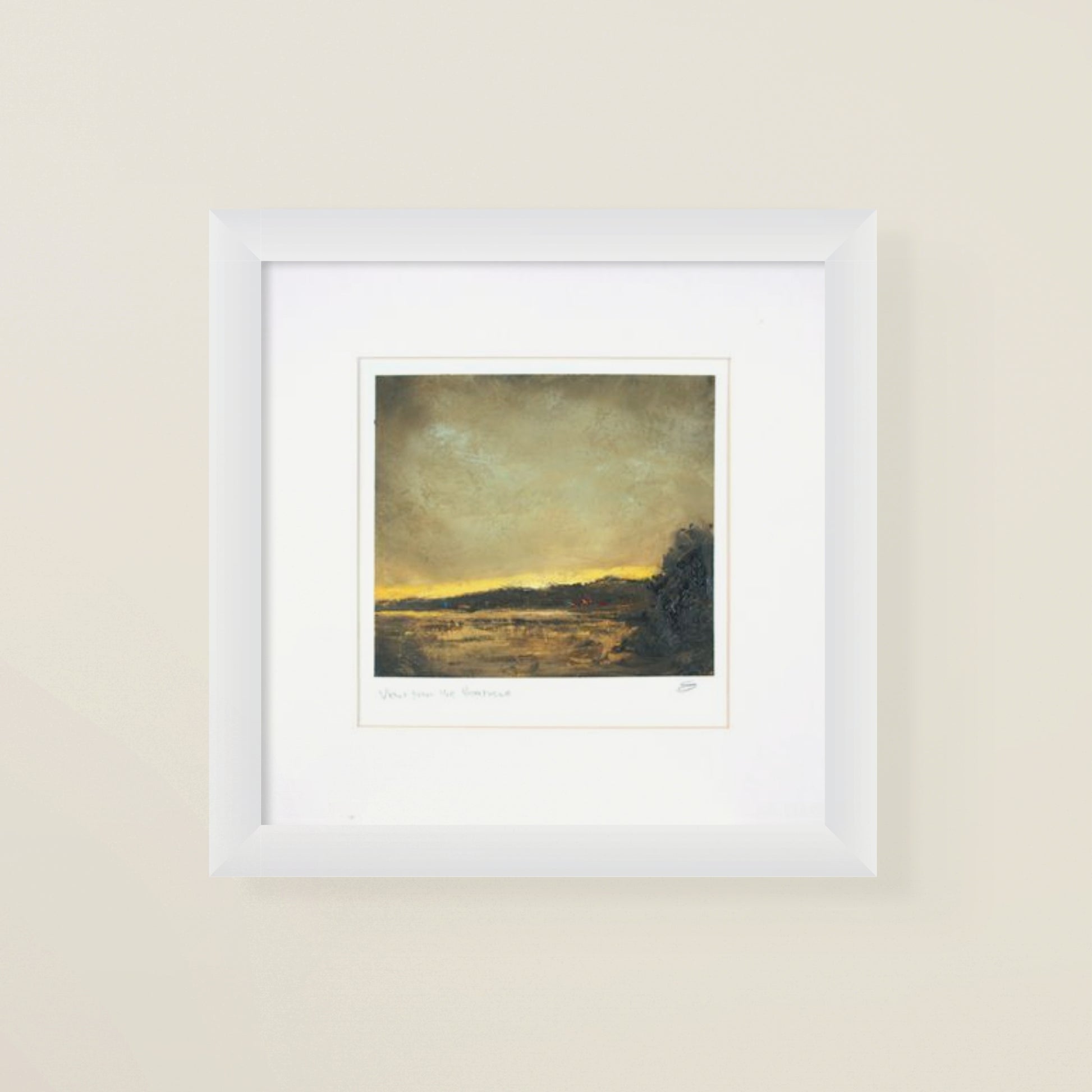 This ready to hang painting measures 7" x 6.3" and is mounted and presented in a 12" x 12" white wooden frame with glass glazing.